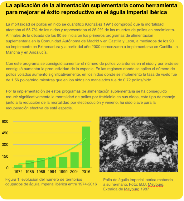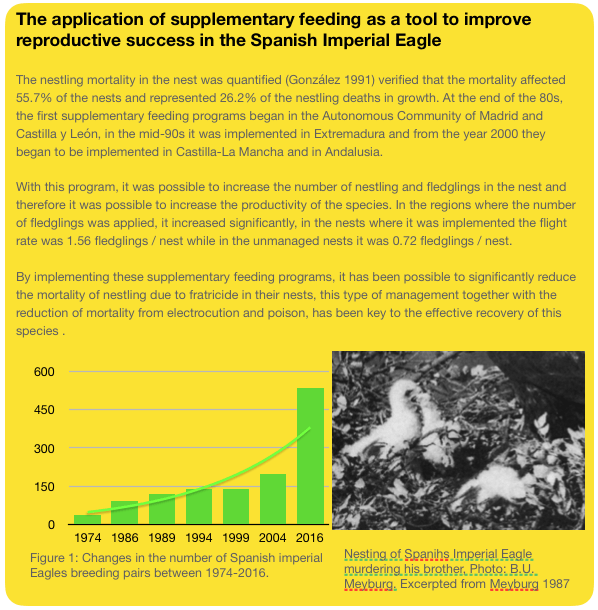 Gonzalez, L. M., Margalida, A., Sanchez, R., & Oria, J. (2006). Supplementary feeding as an effective tool for improving breeding success in the Spanish imperial eagle (Aquila adalberti). Biological Conservation, 129(4), 477-486.